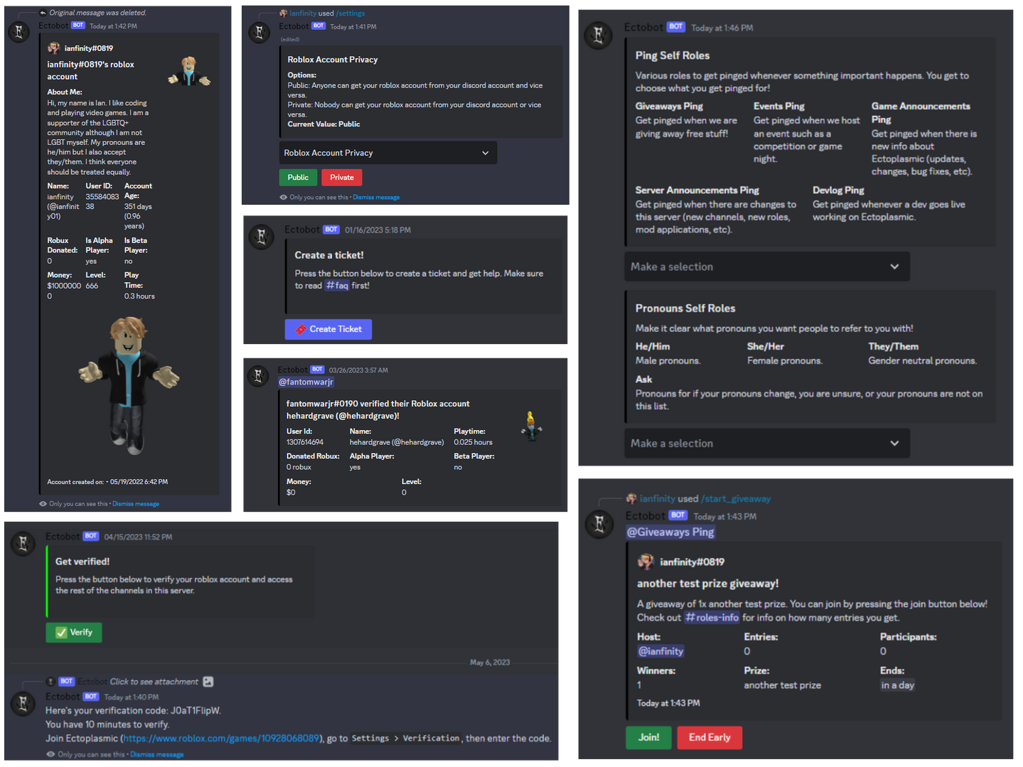 Ectobot is a discord bot that is integrated with a roblox game I'm working on called Ectoplasmic. However, it also has a lot of features that are common for any discord server. Below is a list of features:General Features: